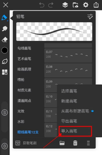 2、选择导入画笔,选择下载的画笔文件即可,自动分类。