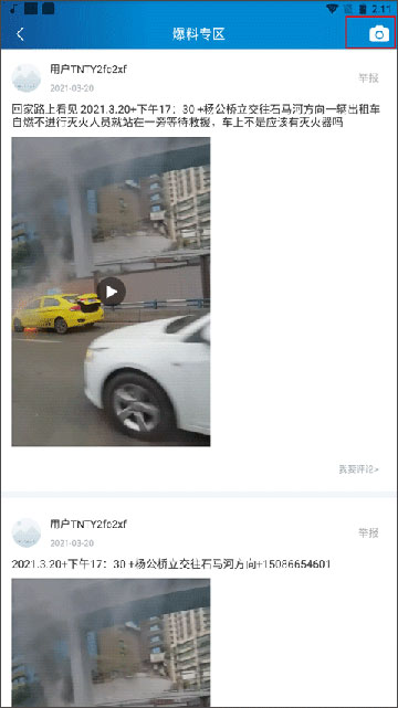 2、这里会有非常多的用户发布的爆料内容,可以根据这件事进行评论,也可以点击右边的举报功能,点击右上方的照相机图标;