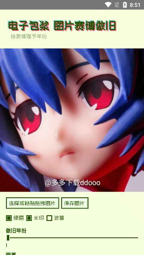 电子包浆生成器电子包浆生成器是一款非常复古有趣的图像处理工具,以“一键做旧,复古模拟”为核心,将普通照片、截图或表情包快速赋予“电子包浆”效果,经过多次转发、压缩、二次上传后产生的模糊、噪点、色彩偏移、水印叠加等年代感特征,以极简操作实现“让新图秒变老古董”的幽默效果。 软件特色 1、 包浆效果,一键生成 画质劣化:降低分辨率(320&ti...