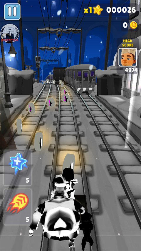 5、节日专属障碍与轨道:地铁轨道上会出现圣诞主题障碍物(如礼物堆、雪人),黑白配色下更显醒目,考验玩家的快速反应与路线规划能力。