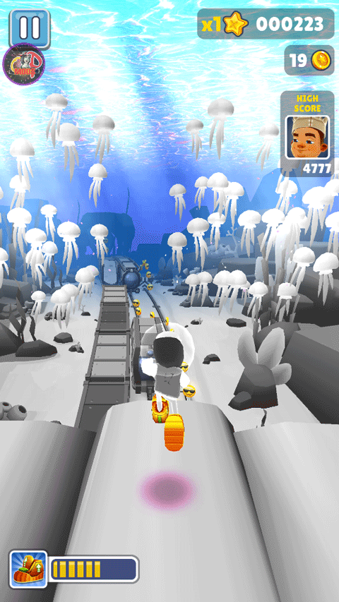 2、巨型章鱼与成群水母互动:跑酷过程中会随机出现巨型章鱼触手拦路攻击,以及成群水母缓慢漂浮,玩家需精准跳跃或滑铲通过,极大提升挑战性。