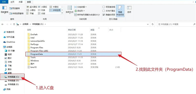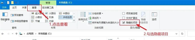 1、为了确保一步到位,打开C盘优先点击查看,然后选择勾选隐藏项目