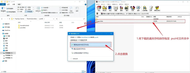 5、将下载保存/下载的存档拉进pvzHE文件夹中,点击替换就导入了,如果前面的存档想要保存一份,可以先备份一下。
