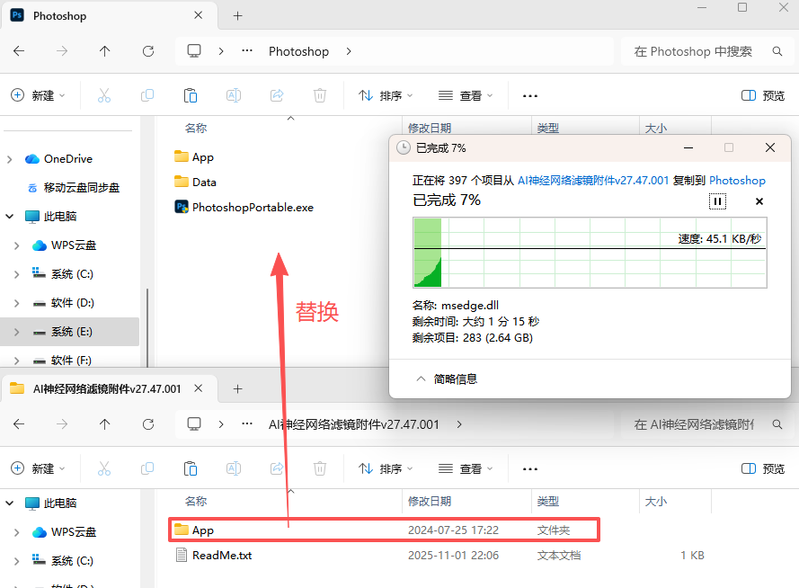 只需要将APP文件夹替换到绿色便携版的根目录替换即可(AI神经网络滤镜离线组件完整数据包[27](v47.001), 适用PS2026-2025)