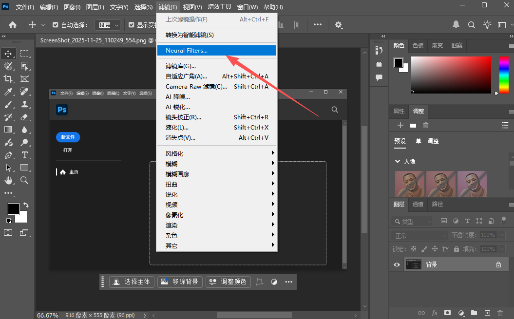 界面菜单->帮助->登陆->登陆成功后,点滤镜菜单->Neural Fiters