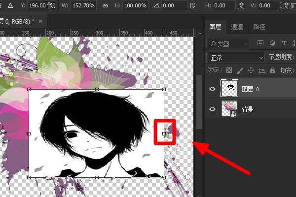 1、将新的图片插入到ps中,用鼠标点击插入图片的图层,然后同时按住键盘上的“Ctrl”键+“T”键打开自由变换,这时被选中的图层将会被一个矩形围住: