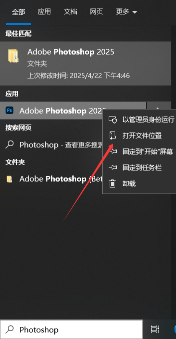 2、随后看到Photoshop图标,继续右键打开文件位置,默认安装路径为【C:\Program Files\Adobe\Adobe Photoshop 2025】;