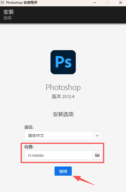 3、打开安装程序后,首先选择安装位置【如果更改了默认位置,则需要记住,后续的激活步骤需要用到】,然后点击继续;