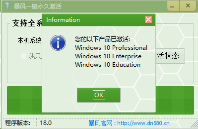 暴风win10一键永久激活工具是由暴风倾力研发打造的一款功能强大的Windows/Office激活工具,又俗称“暴风激活工具、暴风win10激活工具”,工具体积小巧,功能简洁,使用方便,软件无需安装,绿色安全,除了可以激活win10系统之外,还可以支持一键永久激活win7、WIN8和全系列Office软件,全方位满足用户的使用需求!同时,暴风win10激活工具可以自动识别电脑系统版本和office软件,用户根据自己的不同需求从而选择激活系统或者软件,激活的过程方法非常简单,不需要输入任何路径和复杂的操作,只需一键,稍等哦按可就能够完美激活,用户使用体验与正版没有差别。