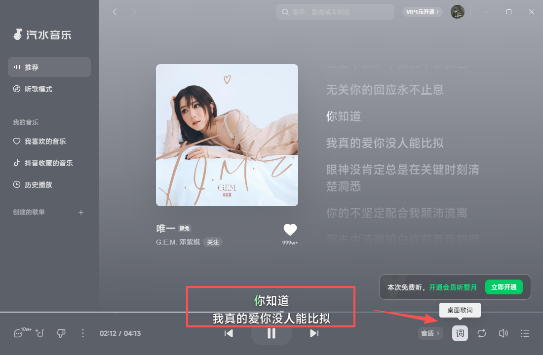 2、找到自己喜欢听的音乐,点击显示桌面歌词即可,如图所示。
