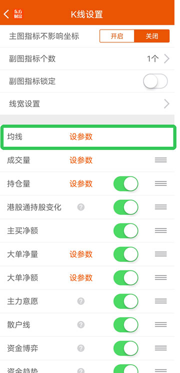 3、再下滑找到【均线】,点击右边的设参数,进入均线参数设置页面。