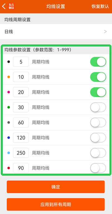 5、选择需要修改的周期,下方就能对均线的具体参数和显示状态进行修改。您最多可以显示8根均线,参数的范围是1一999,超过这个范围是无效的哦!