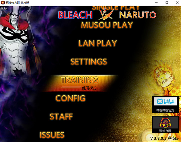 1、下载安装好死神vs火影单机版,运行游戏,选择练习模式;