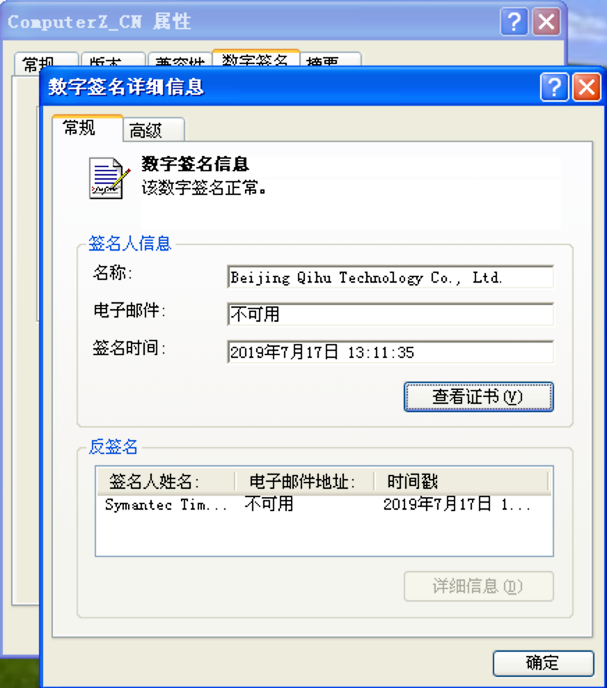 9、最终打开的“数字签名详细信息”界面中,如果左上角显示的是“此数字签名正常。”,并且下面“签名人信息 — 名称” 后的文本框中,显示的内容是"Beijing Qihu Technology Co., Ltd."或"成都奇鲁科技有限公司",那么表示此文件确实是鲁大师的官方文件。