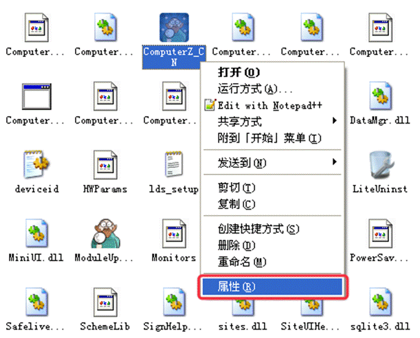 ⑤、右键点击被自动选中的“ComputerZ_CN” 或 “ComputerZ_CN.exe”,选择“属性”,如下图所示: