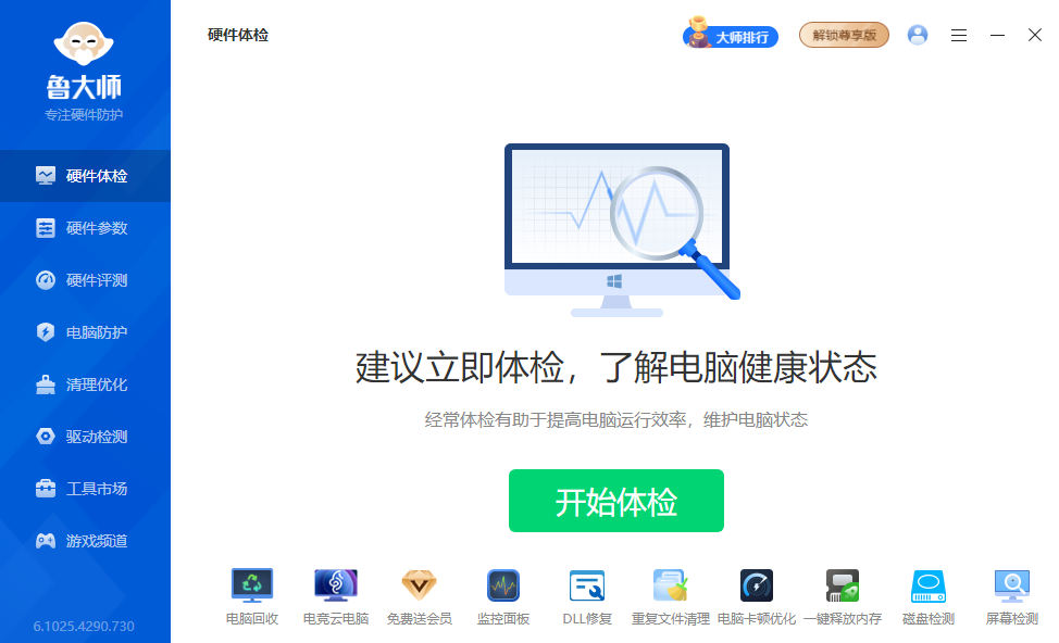 鲁大师电脑版是一款专业的硬件检测工具,能在瞬间对电脑的硬件信息如CPU型号、核心数、频率,显卡的显存、位宽、制造商,甚至是硬盘的容量、转速、使用时长,内存的类型、容量、频率等进行检测,公平公正的跑分测评机制,让你对您的设备硬件情况更了解!此外,鲁大师还是非常好的驱动软件,可以从庞大的驱动数据库中为你的电脑精准匹配最合适的驱动程序,并提供一键下载和安装服务。需要的用户欢迎下载使用!