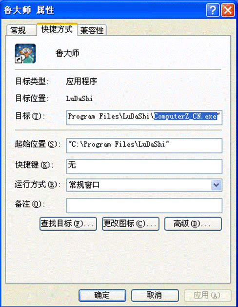 ②、属性页面中,留意一下“目标”指向的最后一节,是不是\ComputerZ_CN.exe 结尾(如果不是,那么请提高警惕,这个鲁大师图标可能是假的):