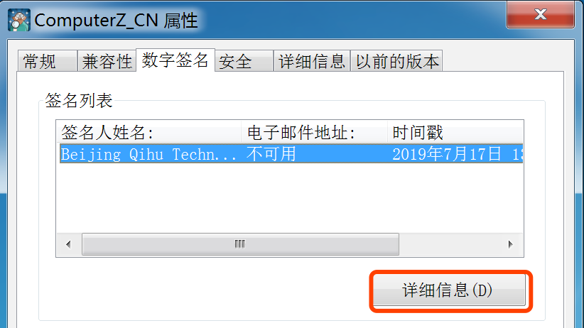 提示:点击”详细信息“后,可能电脑会卡住一小会,此时就算属性窗口变成”未响应“也请耐心等待,因为操作系统正在对此文件进行校验