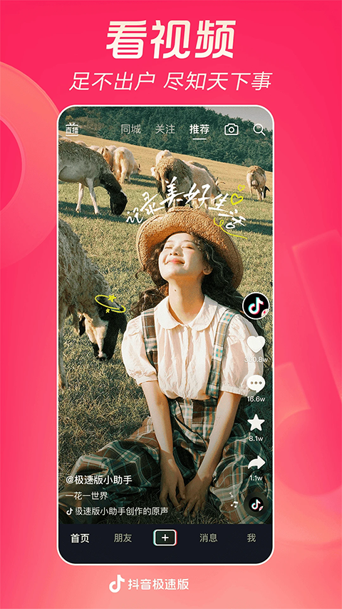 抖音极速版可以看到页面下方的菜单栏显示的是“首页”、“朋友”、“消息”、“我”,跟主体产品抖音相比少了观看直播的入口。