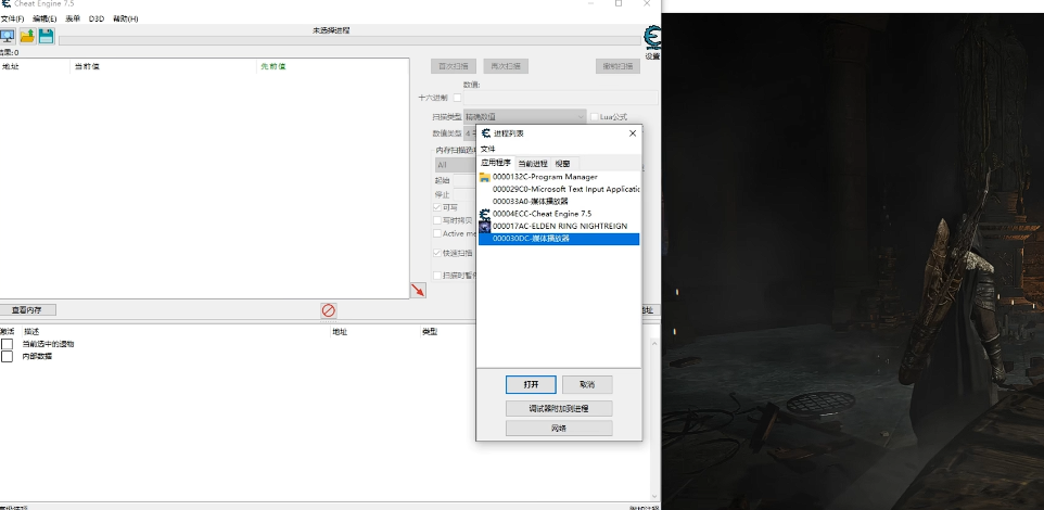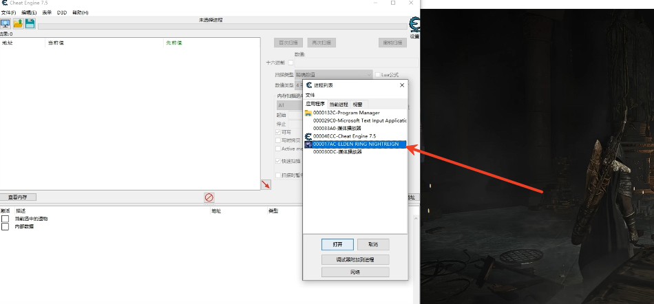 2、进入游戏之后,然后选中CT表找到游戏的应用程序进程。