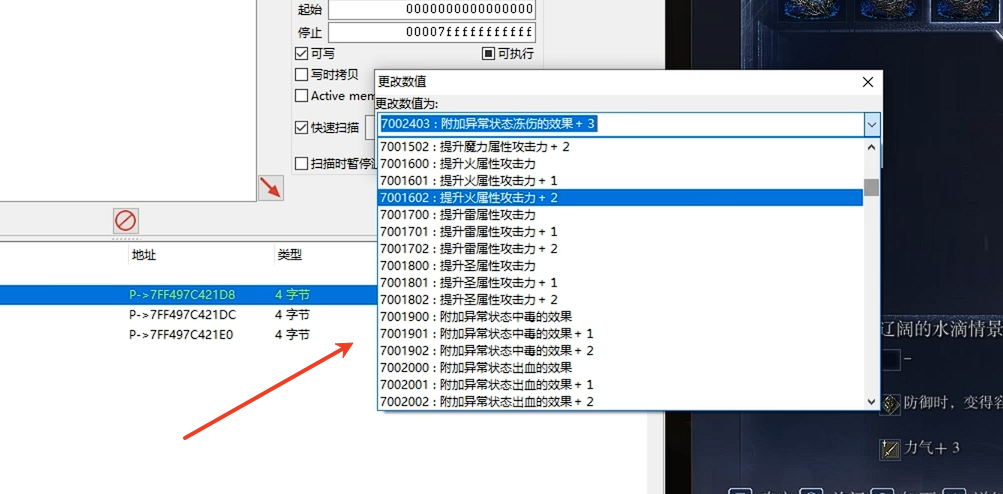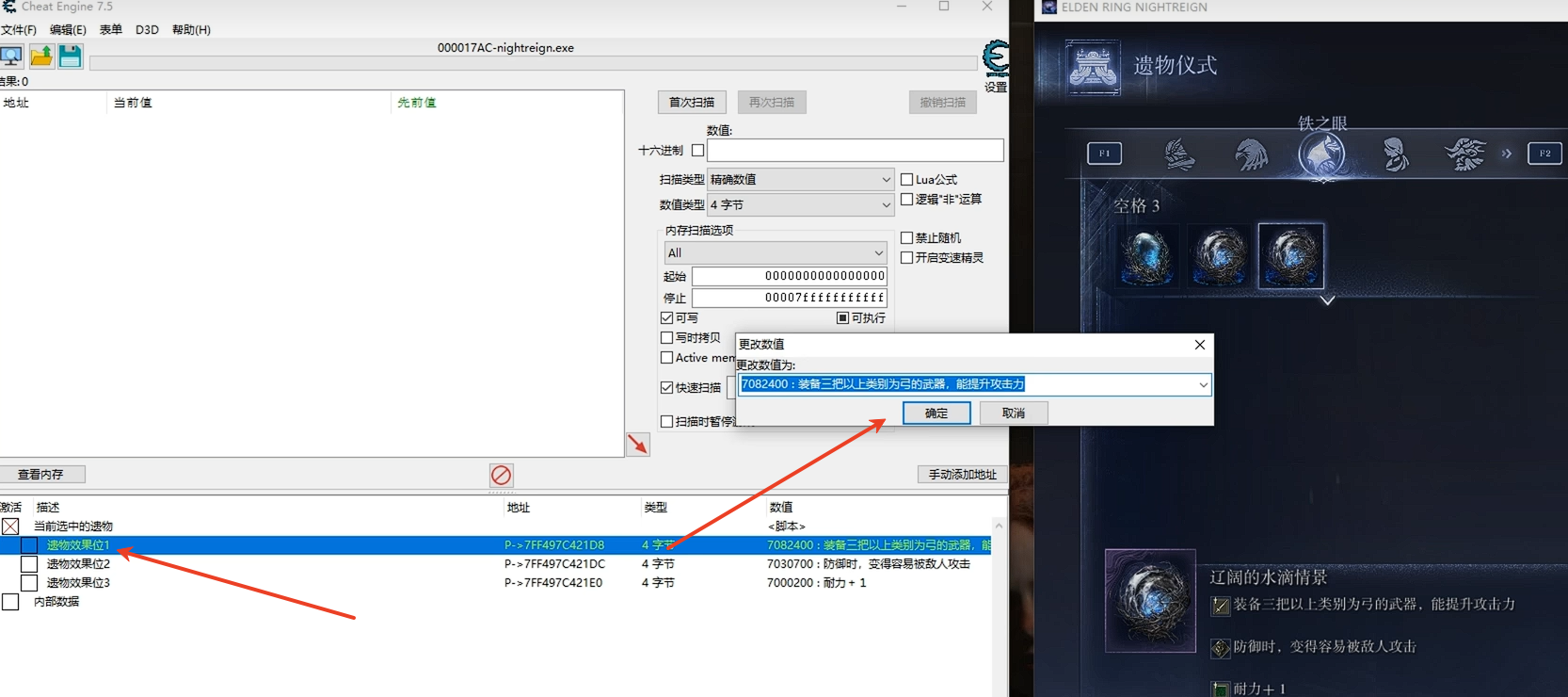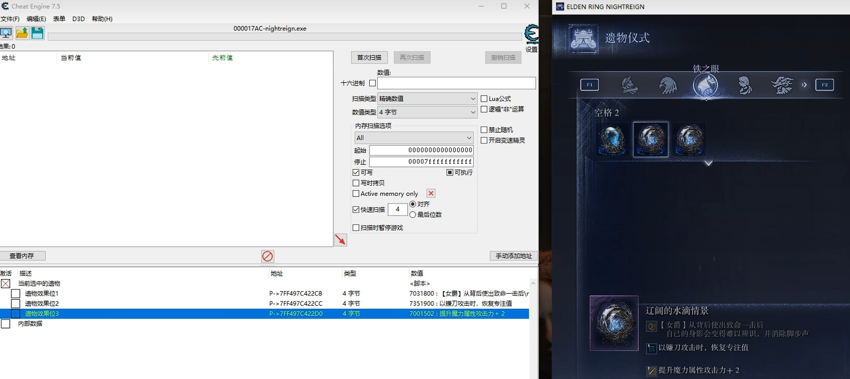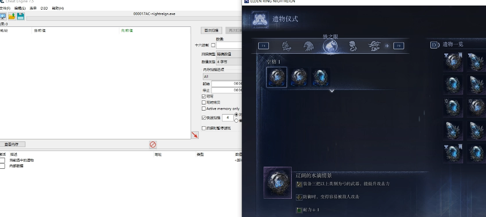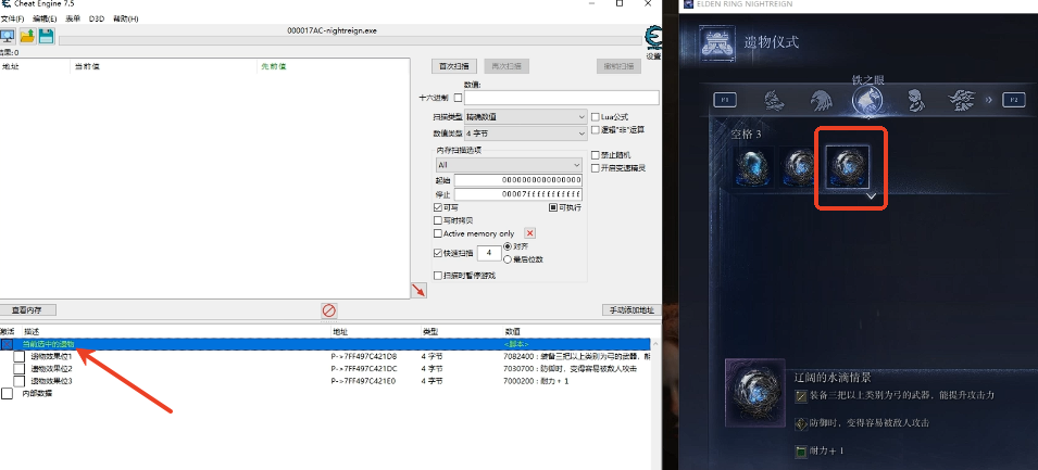 4、装备好之后选中遗物,然后在CT表中选择当前选中的遗物。