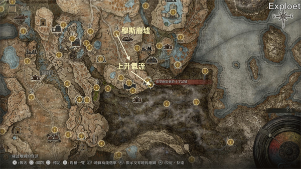 捡完地图后先往东南方岔路探索来到“穆斯废墟”赐福,跟十字记号互动