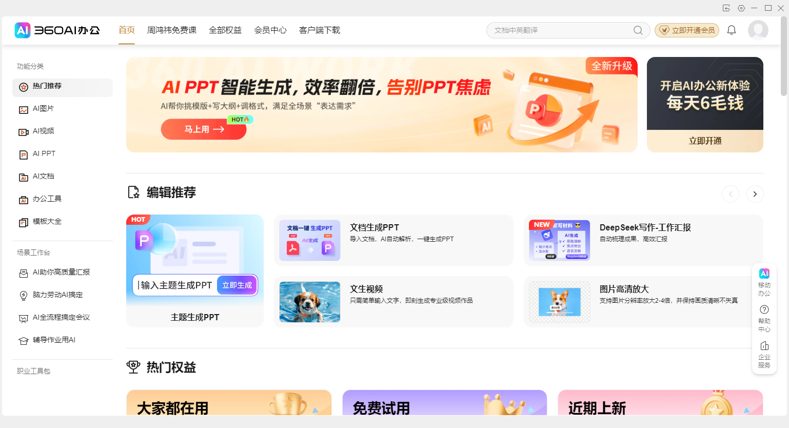 360AI办公软件360AI办公软件是奇虎科技旗下的一款综合性办公软件,专注于利用人工智能技术为用户提供全面、高效的办公解决方案。一站式服务涵盖图片处理、写作辅助、文档转换、AI创意、视频编辑、模板大全等多个核心办公场景,用户无需切换多个应用程序即可完成多样化的办公任务。同时360AI办公软件支持智能纠错、格式转换、实时团队协作、数据分析及可视化功能,同时确保安全加密与用户隐私保护,为您带来高效便捷的办公体验。 3...