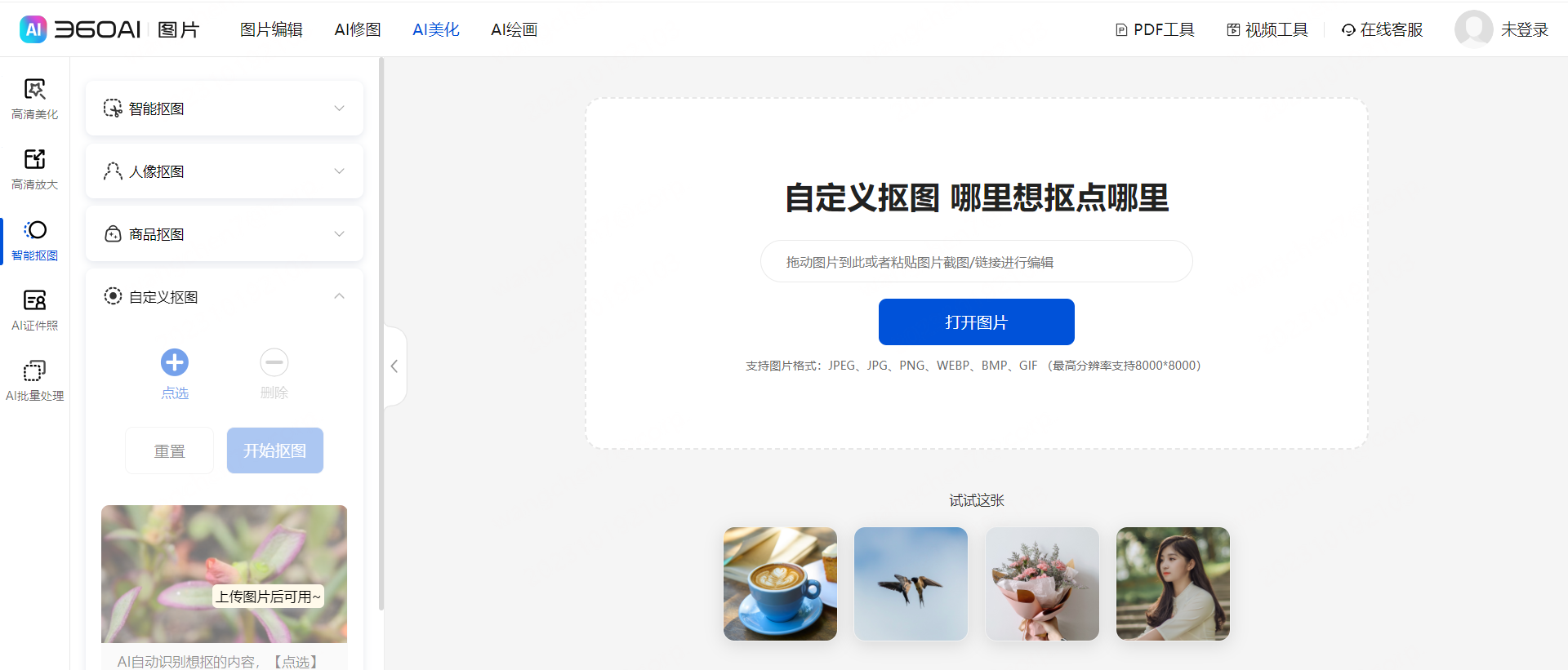自定义抠图功能可哪里想抠点哪里,支持智能自定义选择抠图主体,具体操作步骤如下: