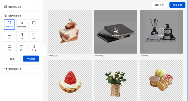批量商品透明图功能支持批量上传商品图片,一键抠图,去除背景。在左侧选择需要的比例,点击按钮或拖动上传文件或文件夹,稍等片刻即可获得透明底图的图片,点击右上角可以批量下载。