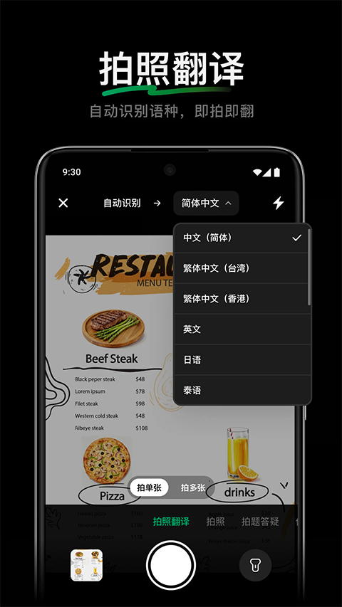 7、支持拍照翻译,自动识别语种,图片直接呈现翻译结果,即拍即翻。