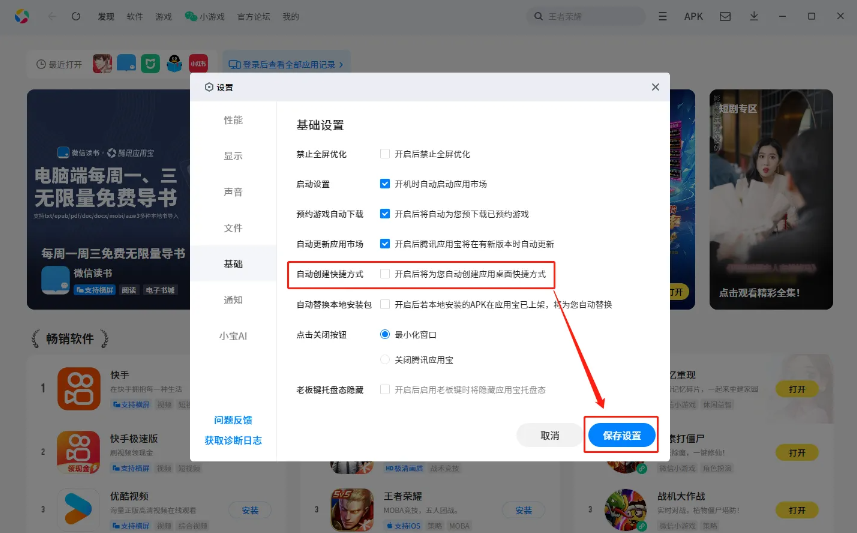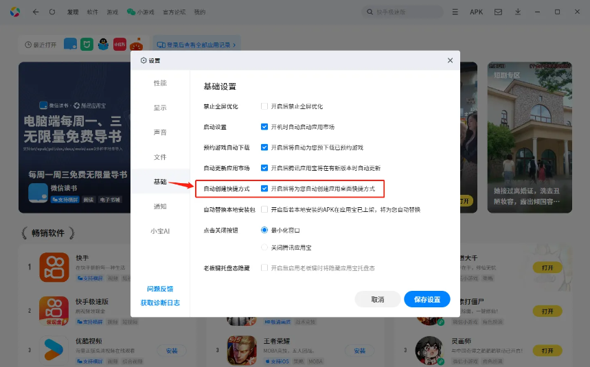 (2)在“基础设置”栏中,找到「自动创建快捷方式」