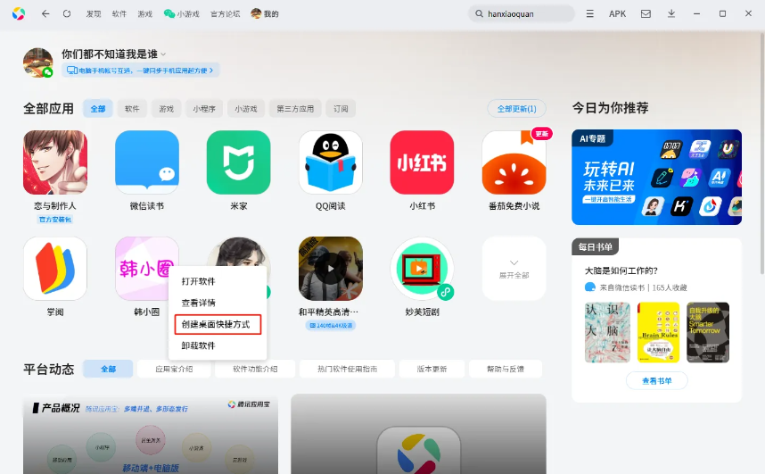 (4)后续安装的应用不会再自动创建快捷方式,但可在市场内 “我的”页面,右键应用图标选择“创建桌面快捷方式”(微信小程序也可参考此方法)