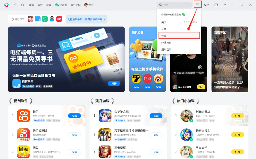(1)点击腾讯应用宝电脑版应用市场右上角 “≡” ,选择 “设置”,进入设置菜单。